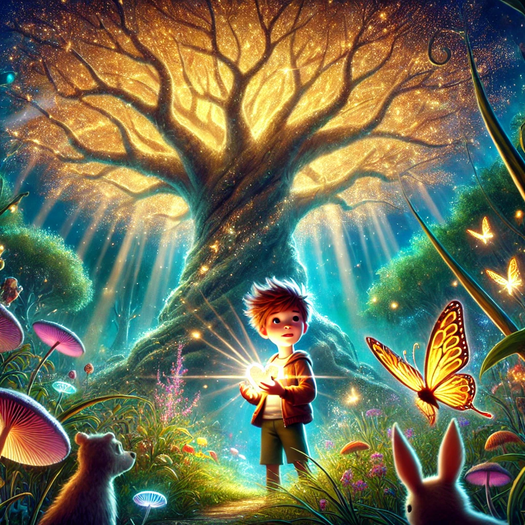At that moment, the Ancient Tree began to shimmer. A soft, melodious voice echoed from its depths. “Timothy, your journey of kindness and courage has awakened the heart of the forest. You have proven that true magic lies within. Step forward and receive your gift.”
