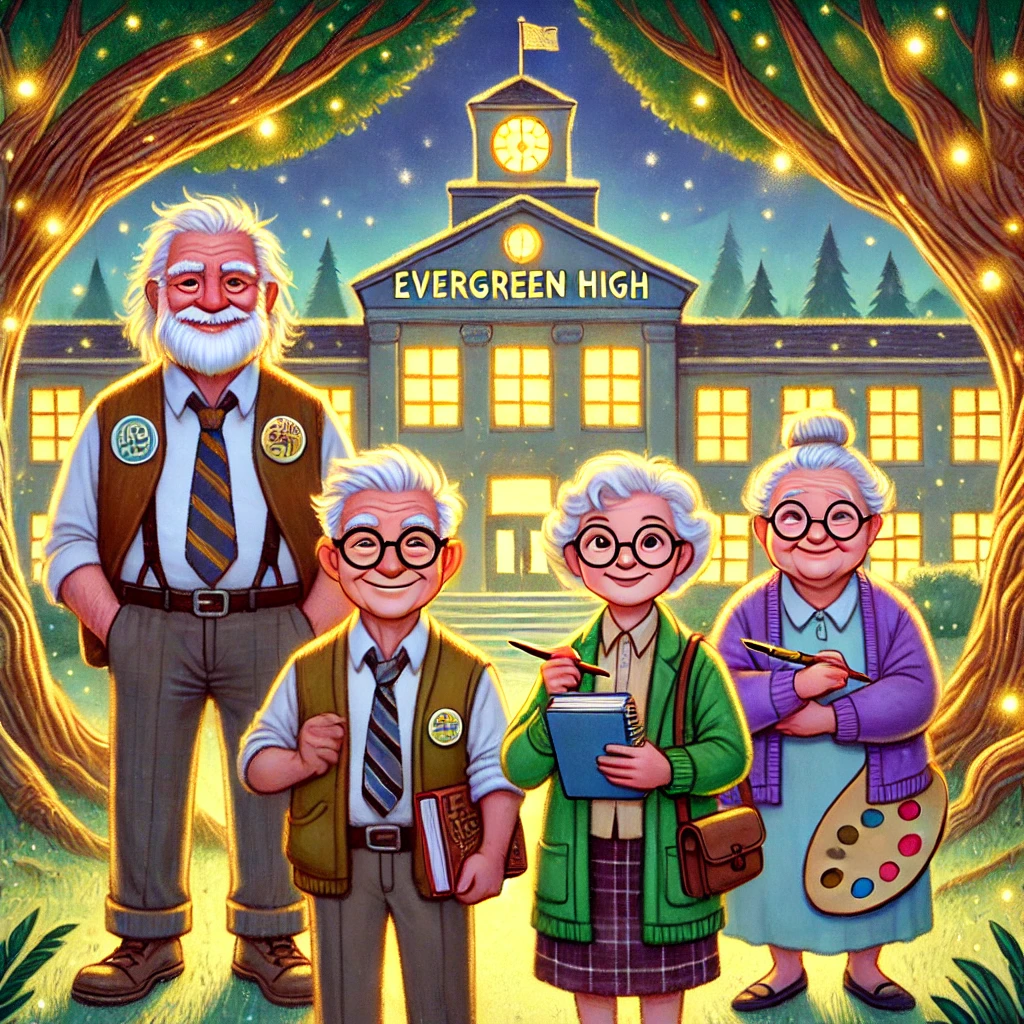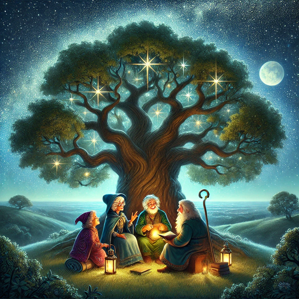 “Every month,” he continued, “the Four Wise Friends would meet beneath the Great Starry Oak atop Moonlit Hill. There, they would share stories, lessons, and wisdom collected over their many, many years. They believed that every soul, no matter how old, never stopped learning.”